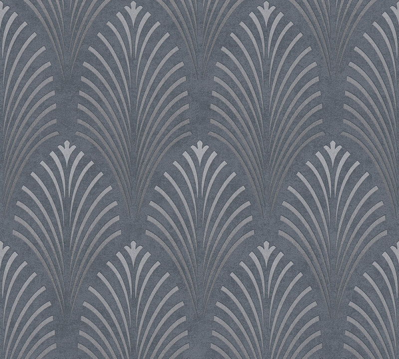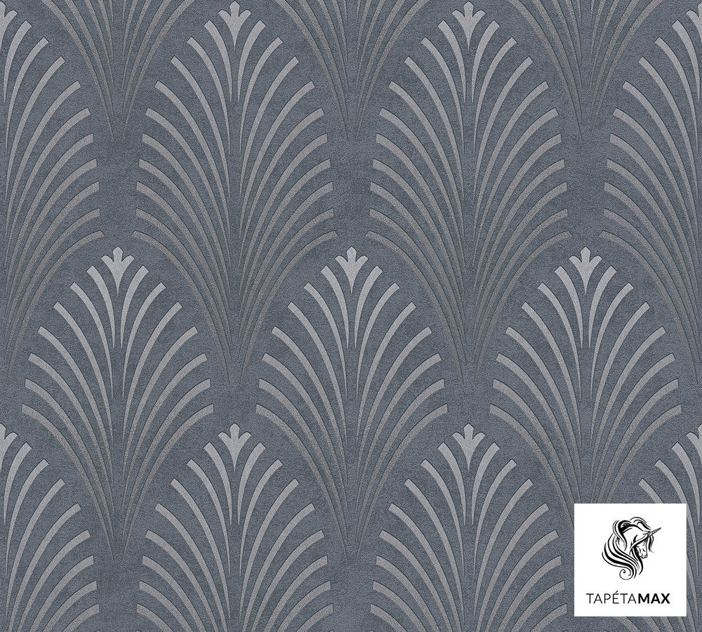 Sötét szürke alapon fényes ezüst hatású legyező mintás vlies dekor tapéta.